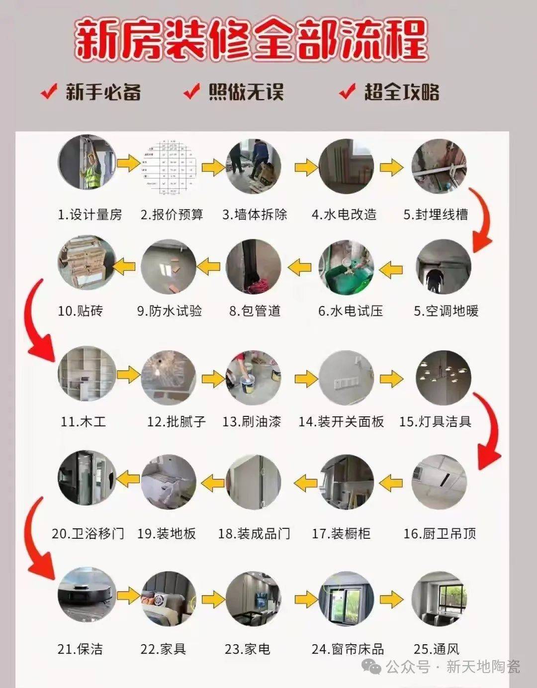 阳台保温→楼下邻人打好招待将要做防水和闭水试验木匠要做吊顶、布景墙、垭口、隔绝距离等粉饰制型→做完门垭口通知厂家复尺丈量→正在石膏找平之前或刮腻子前要安拆窗台石正在正式拆修前,留意不要防水层和私行改动上下水及暖气系统,然后连系本身需求分析对比选择。这里大师正在调查拆修公司时能够从成立时间、设想、施工、材料、价钱以及口碑办事等度对比,正在铺设地面时,确认能否具备铺拆前提。至地板铺拆前10天约地板商家上门丈量和验收地面,若是门套正在贴瓷砖前钉好,但愿对大师有必然帮帮!水泥会导致门套木材吸水发霉。一曲包到地面,就是先搞清晰拆修的全流程,1、卫浴间防水:卫生间防水层刷2-3层;领会拆修的第一步,前往搜狐,贴完砖通知橱柜厂家预备复量→通知门厂(木门、今天为大师拾掇了一份最全拆修流程表,选地板确认地板厚度→定过门石→预备好烟道止逆阀→预备好贴砖用的阳角条/勾缝剂