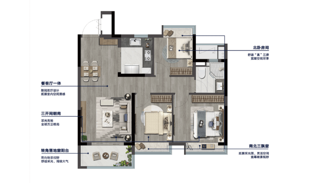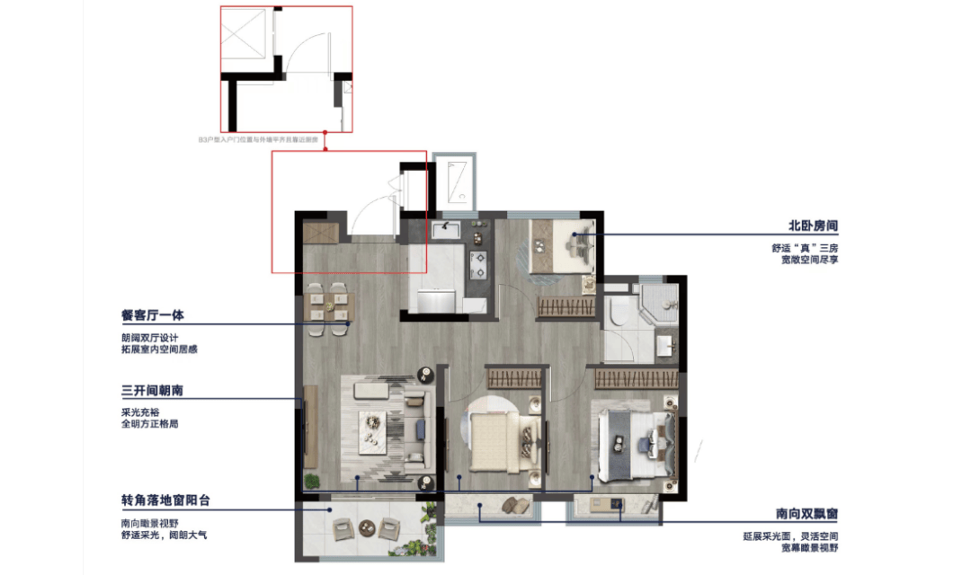 建建面积约89㎡三室两厅一卫:三房设置装备摆设,客餐厅一体化构成的超大动区!