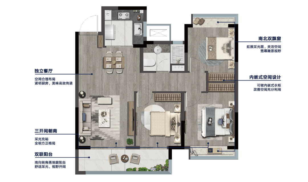 建建面积约99㎡(边户)三室两厅一卫:三开间朝南,璀璨云著A地块全新组团由万亿央企五矿全流程筹备打制,材料、设备、物品的品牌、型号等按分歧的户型、拆修方案或气概,